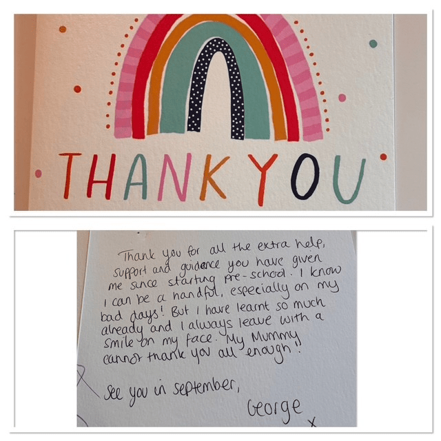 A big thank you for giving Jude the best start at school life. He has absolutely loved his time at Cuckoo and he will miss you all lots.