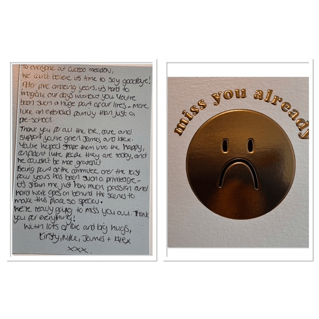 Words cannot express how grateful we are to you all for giving both Molly and Poppy the most fantastic start in life. Both girls have blossomed under your care and have loved their time with you. Thank you for the kindness and love you gave them. We will sorely miss our time at Cuckoo Meadow and all of the teachers xx